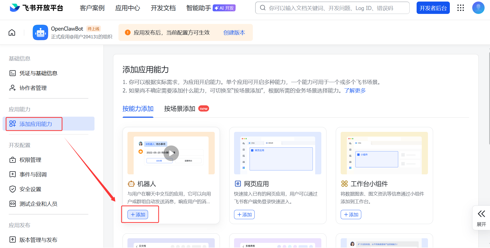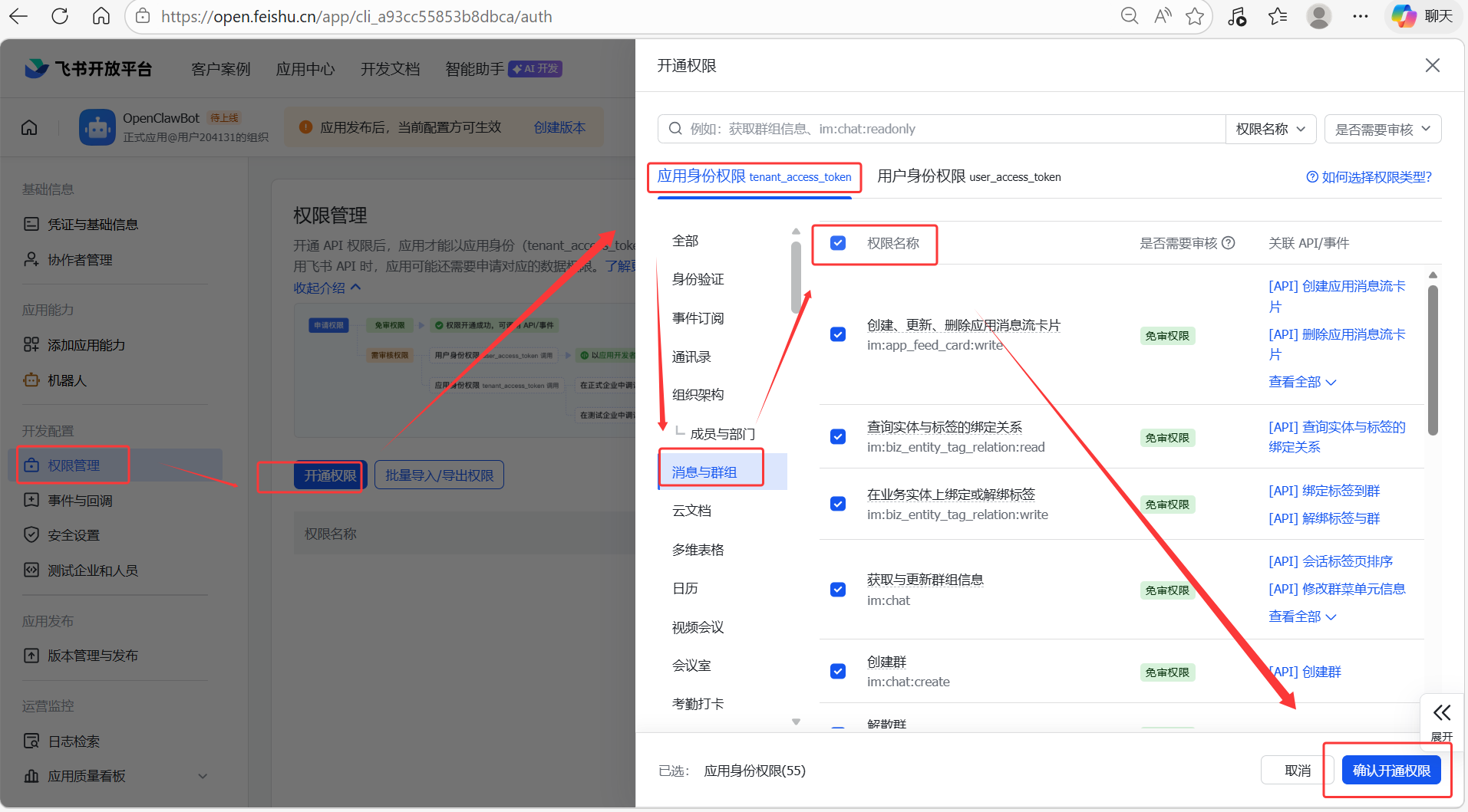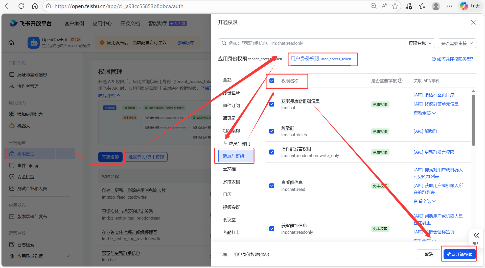 这里我们添加聊天与群组权限,注意应用身份权限和用户身份权限都要开通,可以搜索