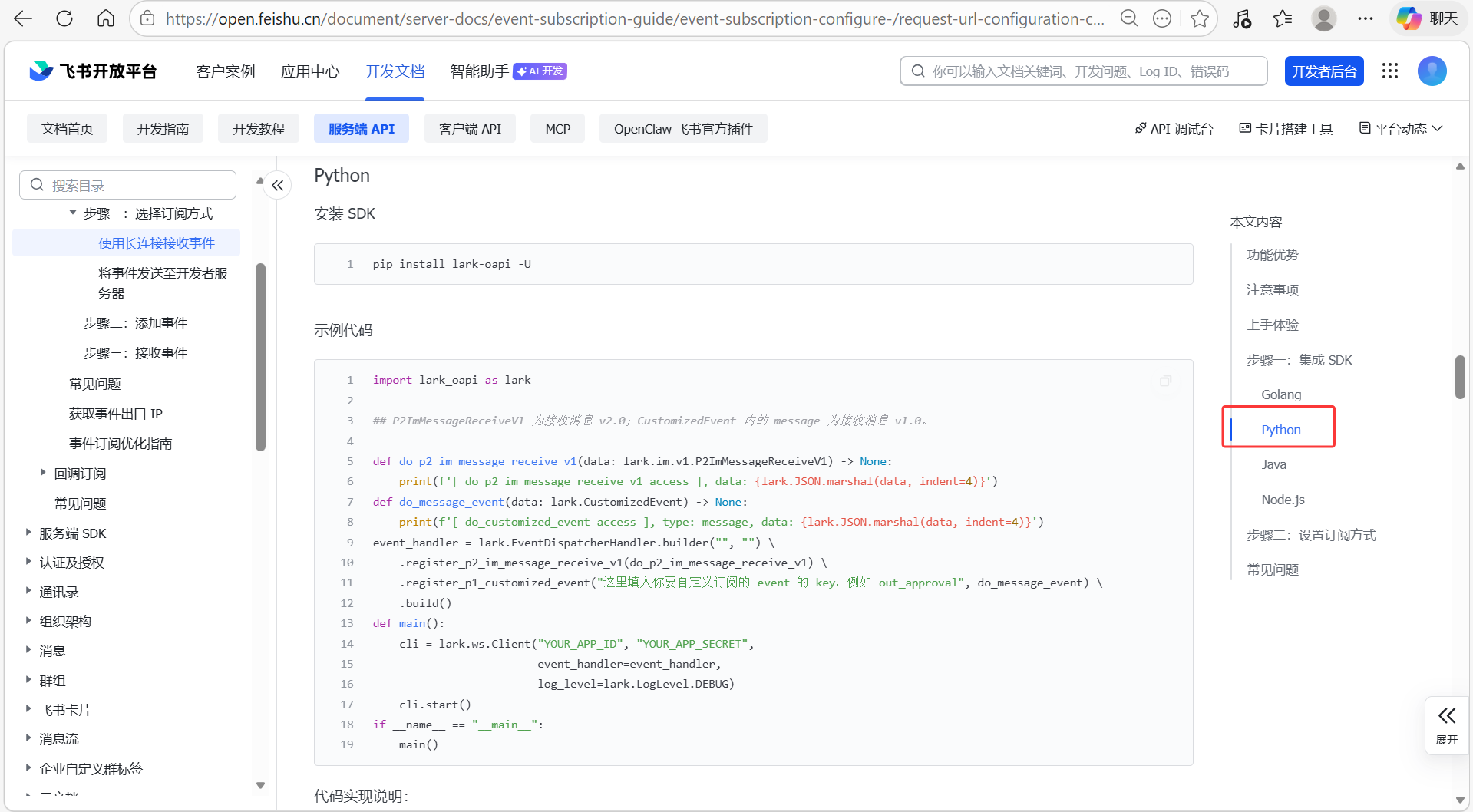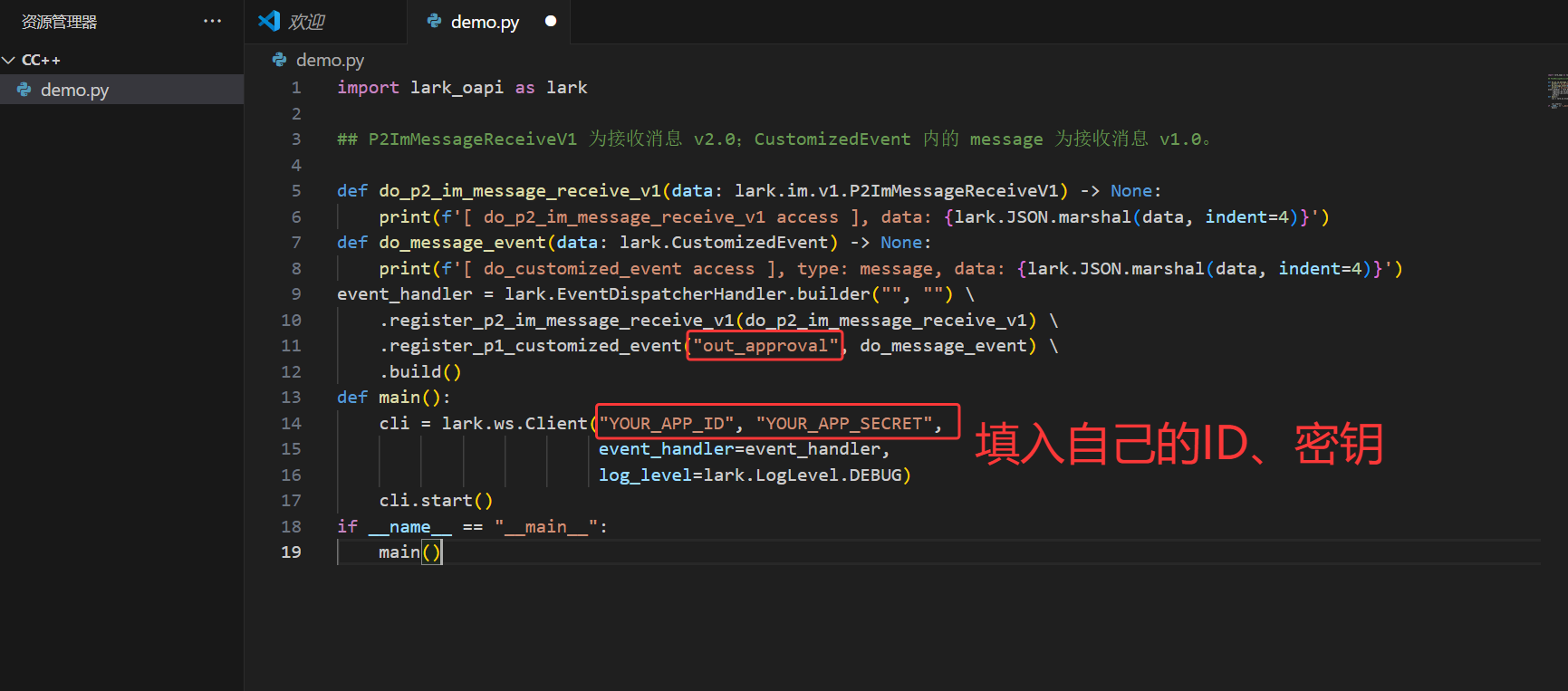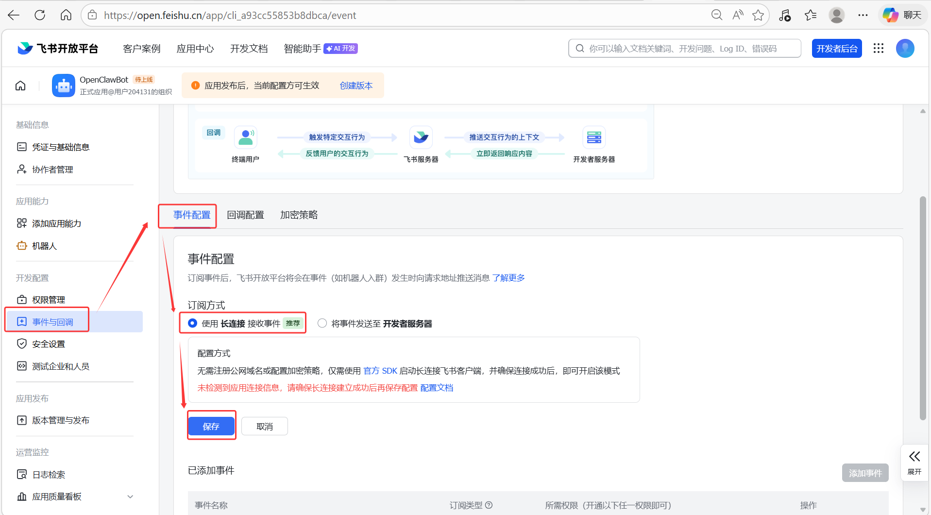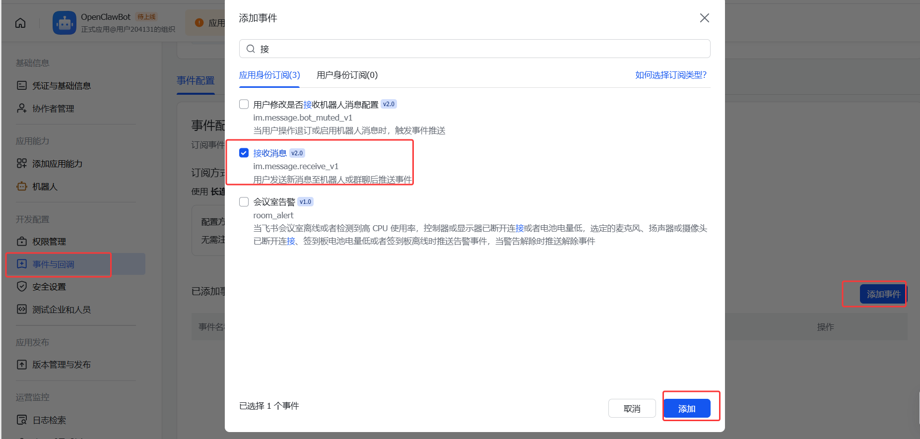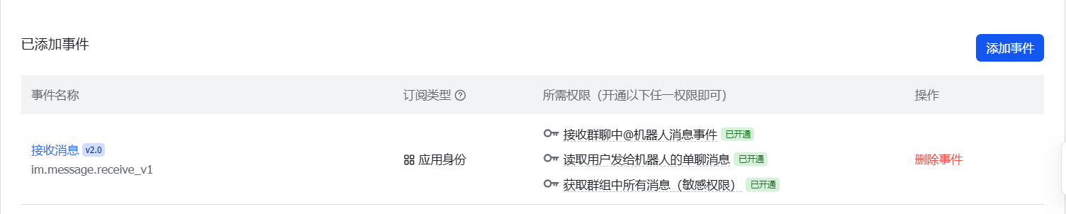 再回到第六步:启用机器人能力保存。此时可以停掉python执行脚本。 - 添加事件