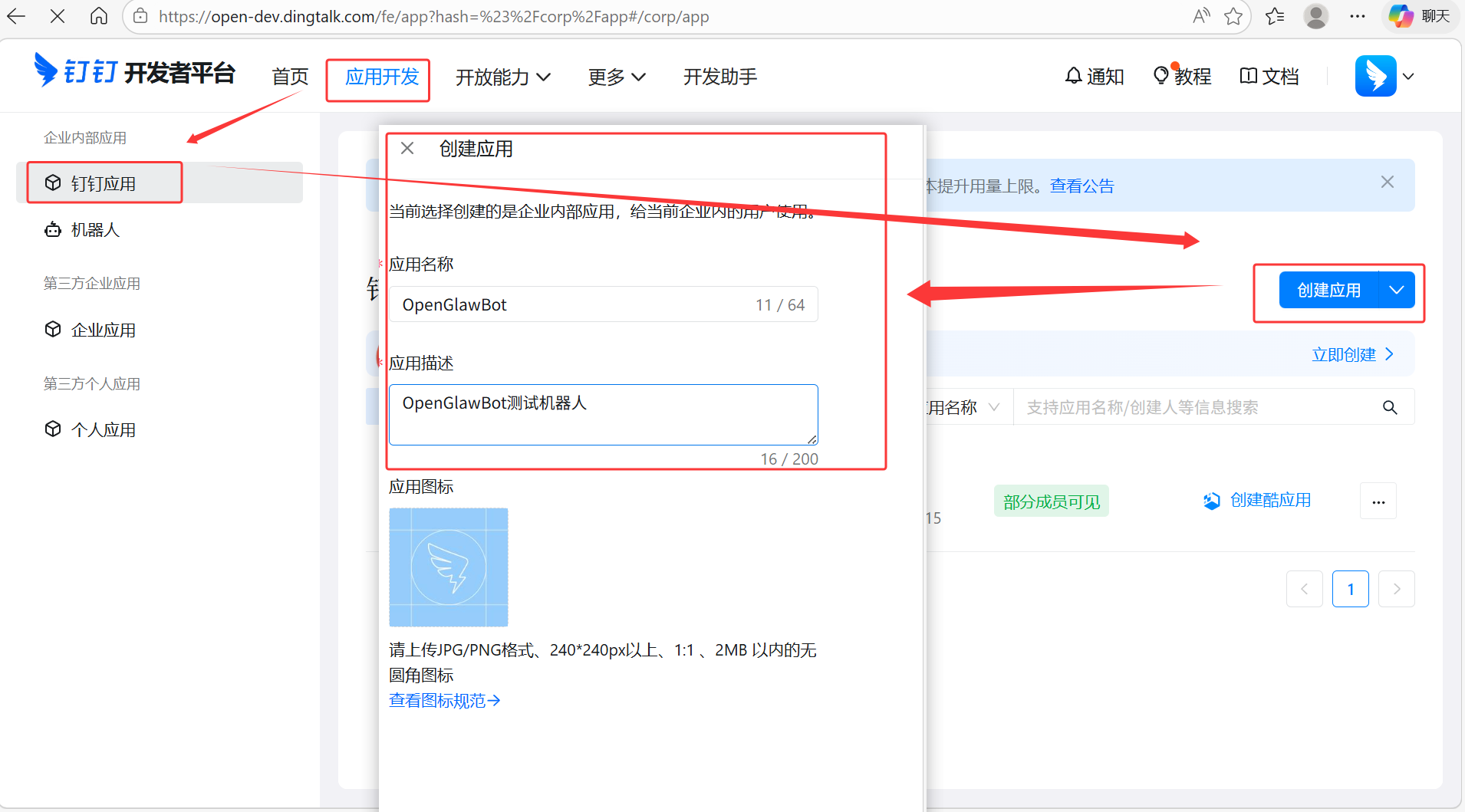 钉钉官网:https://open-dev.dingtalk.com/,注册流程按提示即可完成 - 第二步:应用开发→钉钉应用→创建应用