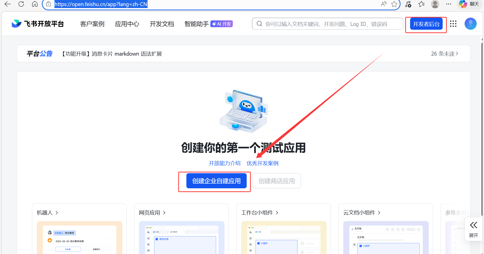 飞书官网:开发者后台 - 飞书开放平台,注册流程按提示即可完成 - 第二步:创建企业自建应用