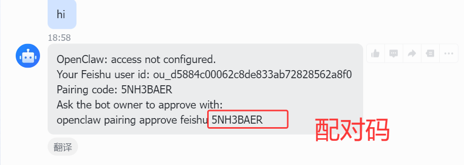 - 第三步:配对授权。默认情况下,机器人会回复一个 配对码。您需要批准此代码批准后即可正常对话。