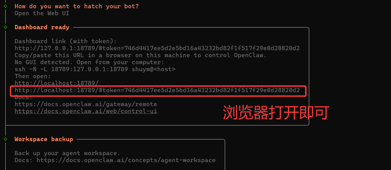 openclaw dashboard –no-open - 将 WebSocket URL 和令牌粘贴到上方,或直接打开带令牌的 URL。