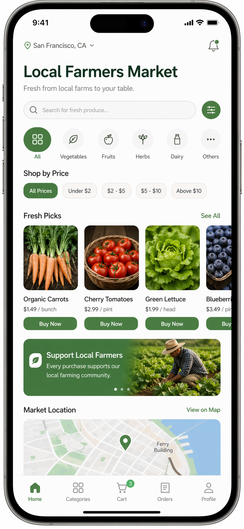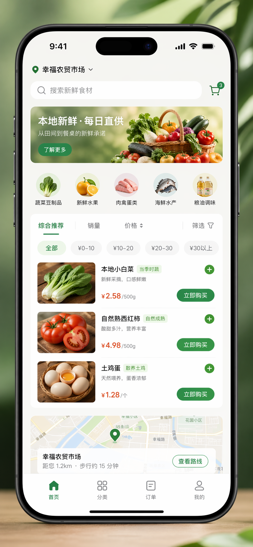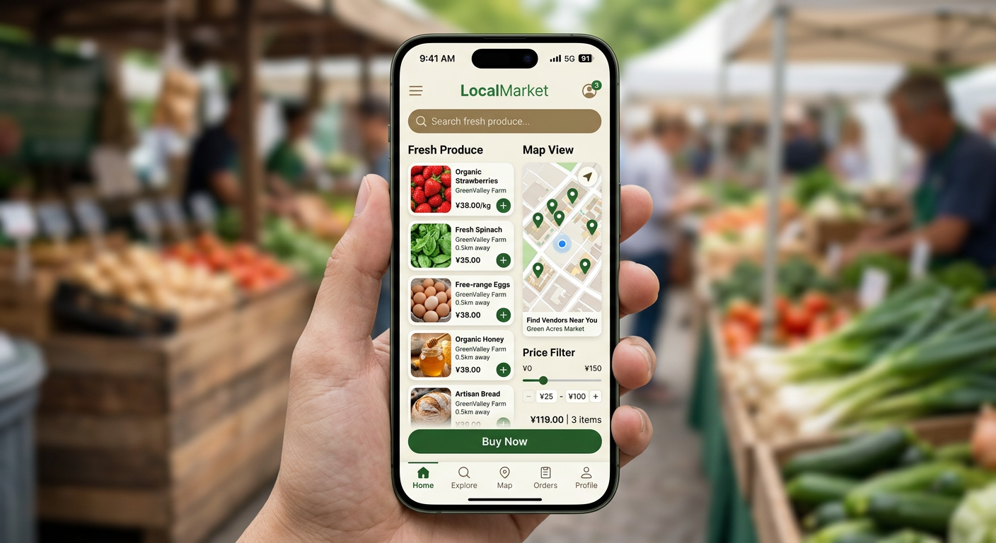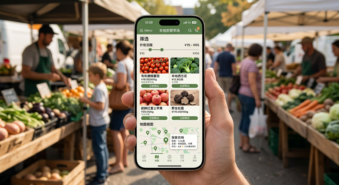 使用 iPhone 17 Pro 为本地农贸市场创建一个逼真的移动应用模型。应用界面应包含新鲜农产品列表、价格筛选器、地图视图和“立即购买”按钮。界面应采用简洁的极简主义风格,以绿色和大地色系为主,分辨率要高,并包含状态栏和刘海屏。