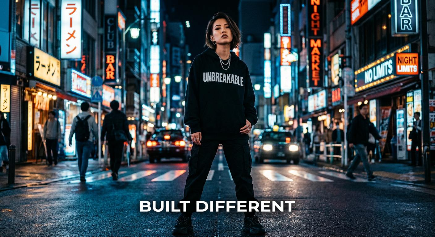 “Design a stylish streetwear brand advertisement. A confident model wearing a black oversized hoodie with bold white text ‘UNBREAKABLE’ across the chest. Urban night city background, neon lights, cinematic lighting, high fashion photography style. Include the tagline ‘Built Different’ in clean sans-serif font at the bottom.”