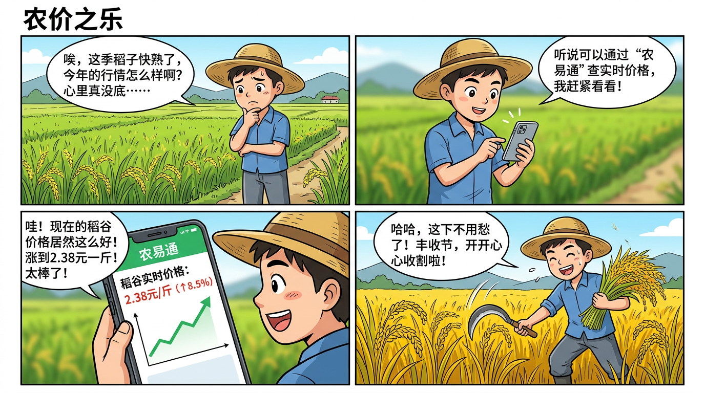 创作一个四格漫画,风格简洁明快,类似中国漫画。第一格:一位年轻的农民站在田里,一脸忧虑。第二格:他打开手机上的一个应用程序。第三格:应用程序显示实时市场价格。第四格:他露出笑容,高兴地收割庄稼。添加对话框,文字清晰,色彩鲜艳,人物设计风格统一
