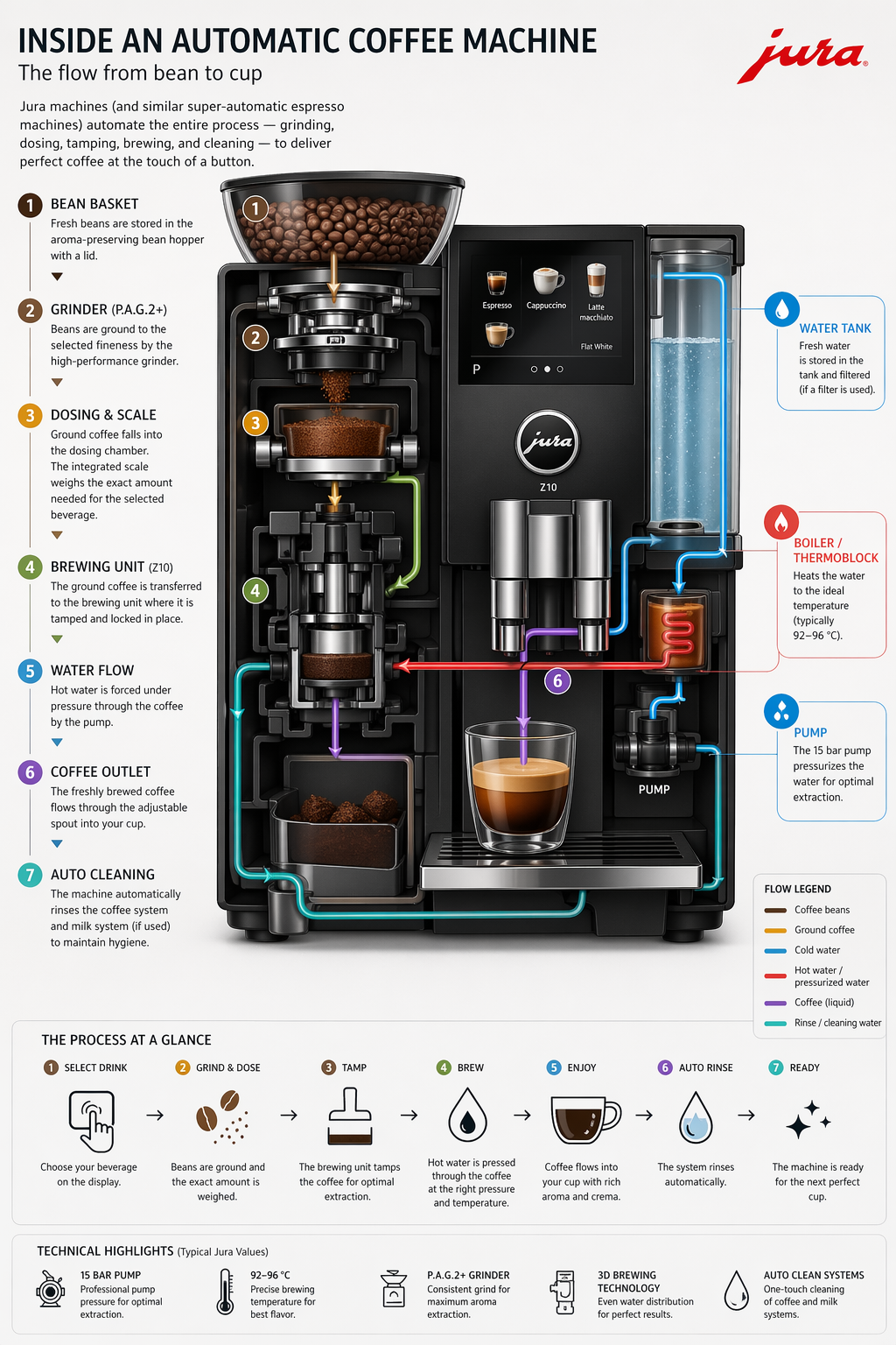 “Create a detailed infographic of the functioning and flow of an automatic coffee machine like a Jura. From bean basket, to grinding, to scale, water tank, boiler, etc. I’d like to understand technically and visually the flow. Use clean modern design, labeled arrows, and clear text explanations.”