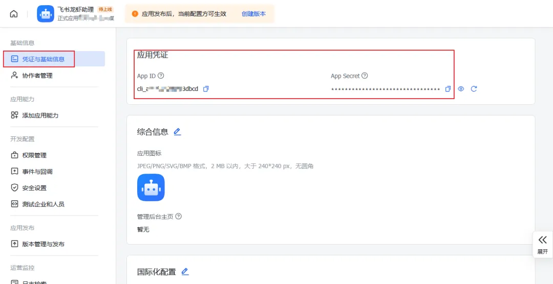 Step2:在创建应用界面中,输入应用名称和描述,选择一个我喜欢的图标,点击”创建”按钮即可创建一个应用。应用创建好之后会有一个应用凭证,这是OpenClaw接入飞书的通行证。