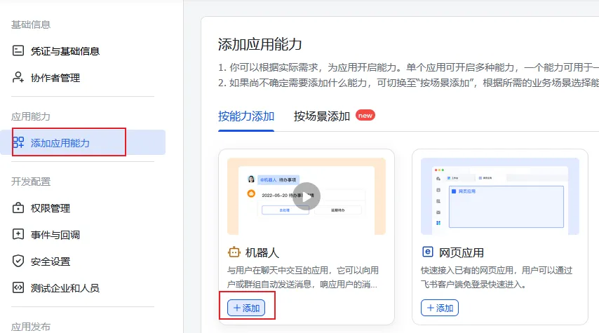 Step3:在应用主界面,点击左边导航栏,选择”添加应用能力”按钮,再点击机器人里的”添加”按钮,添加机器人助理。