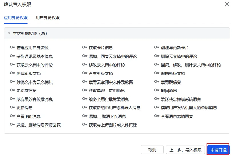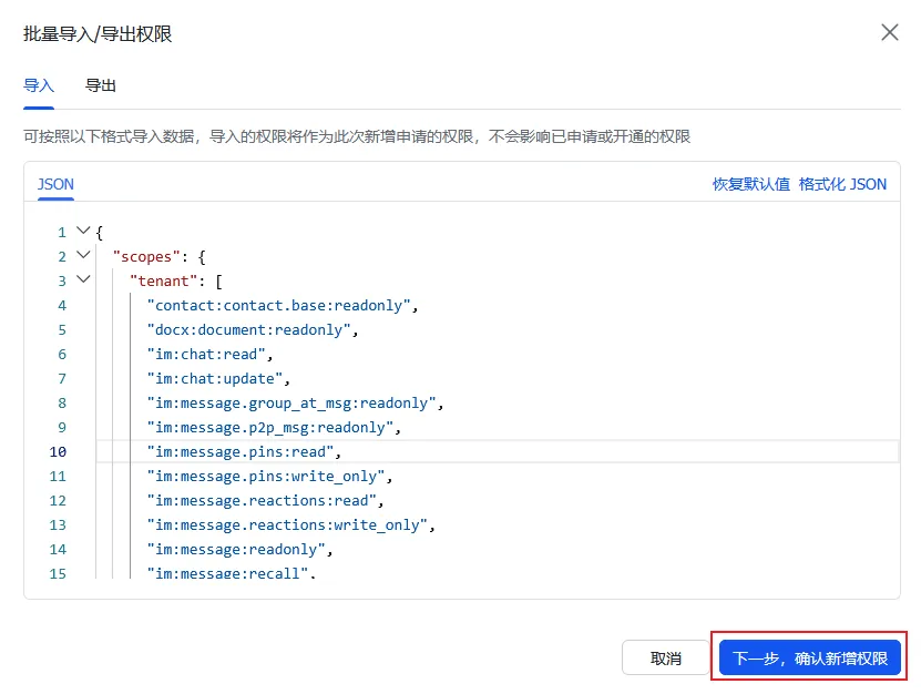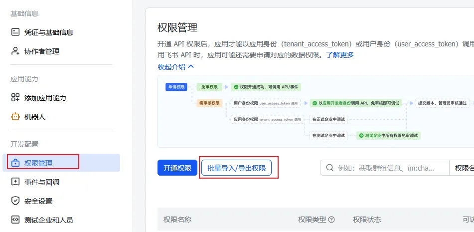 Step4:接着在应用主界面,再点击左边导航栏,选择”权限管理”按钮,再点击”批量导入/导出权限”按钮,输入需要开通权限的JSON信息,依次点击确认新增权限,最后选择确认开通即可,如果刚开始不想开通这么多权限,则使用默认的权限也可以,后续需要用到时再授权开通。