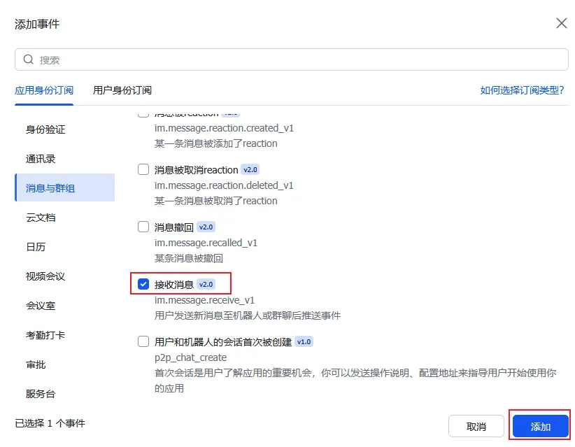 Step6:添加事件里勾选”接收消息”按钮,点击”添加”按钮。