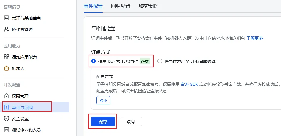 Step5:接着在应用主界面,再点击左边导航栏,选择”事件与回调”按钮,订阅方式选择使用长连接接收事件,点击”保存”按钮。