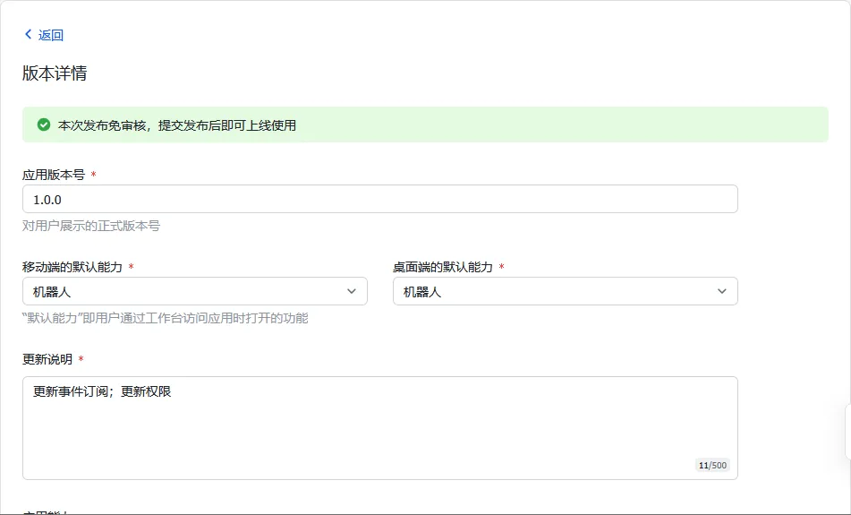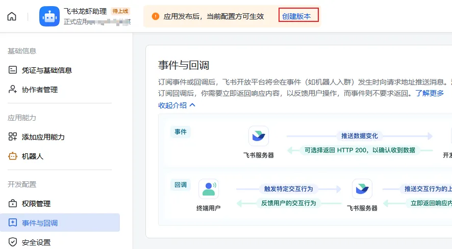 Step7:最后再点击”创建版本”按钮,把这个新建的企业应用进行版本发布,正式上线,这样我的飞书机器人助理应用就创建完成了。