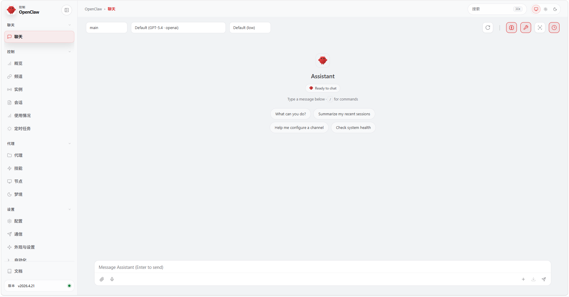 复制第一项链接到浏览器打开(类似“Dashboard URL: http://127.0.0.1:18789/#token=XXXX")即可看到OpenClaw控制台。