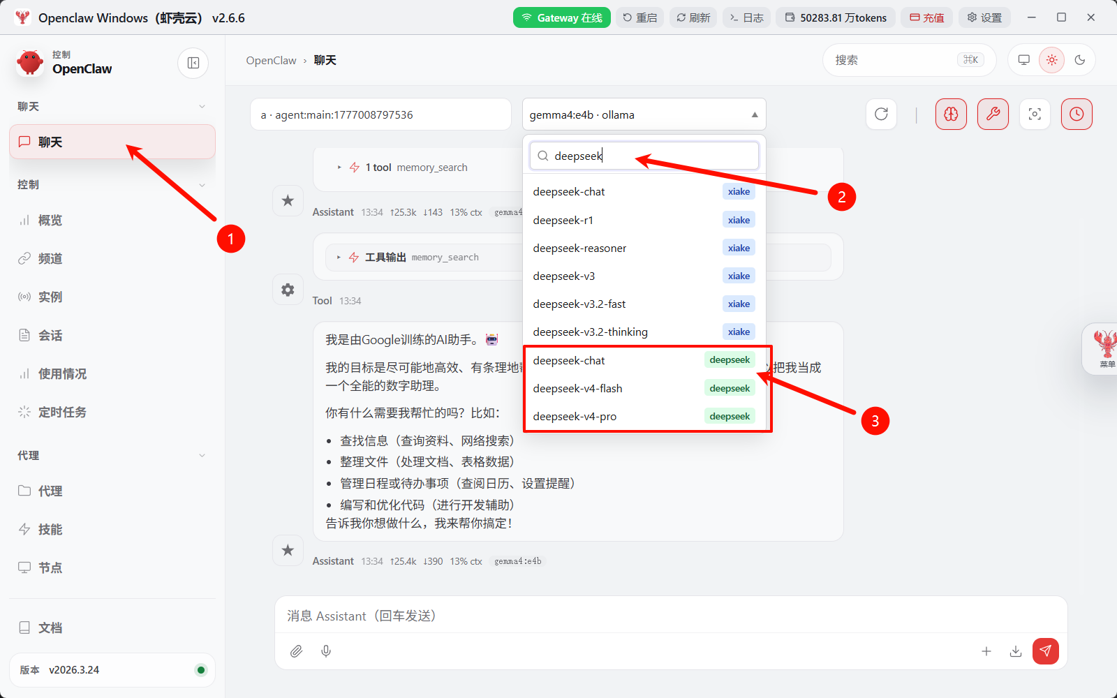 进入 OpenClaw 左侧聊天页面,在模型选择框搜索 deepseek。可选择常用模型:deepseek‑chat、deepseek‑v4‑flash、deepseek‑v4‑pro。选中模型后即可开始对话使用。