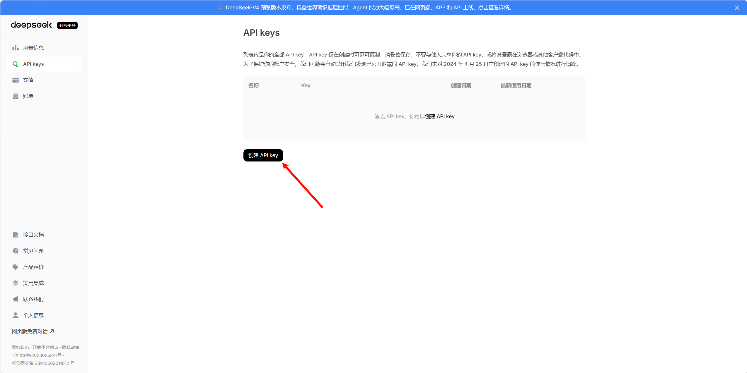 在左侧菜单栏点击 API keys。无可用密钥时,点击创建 API key。