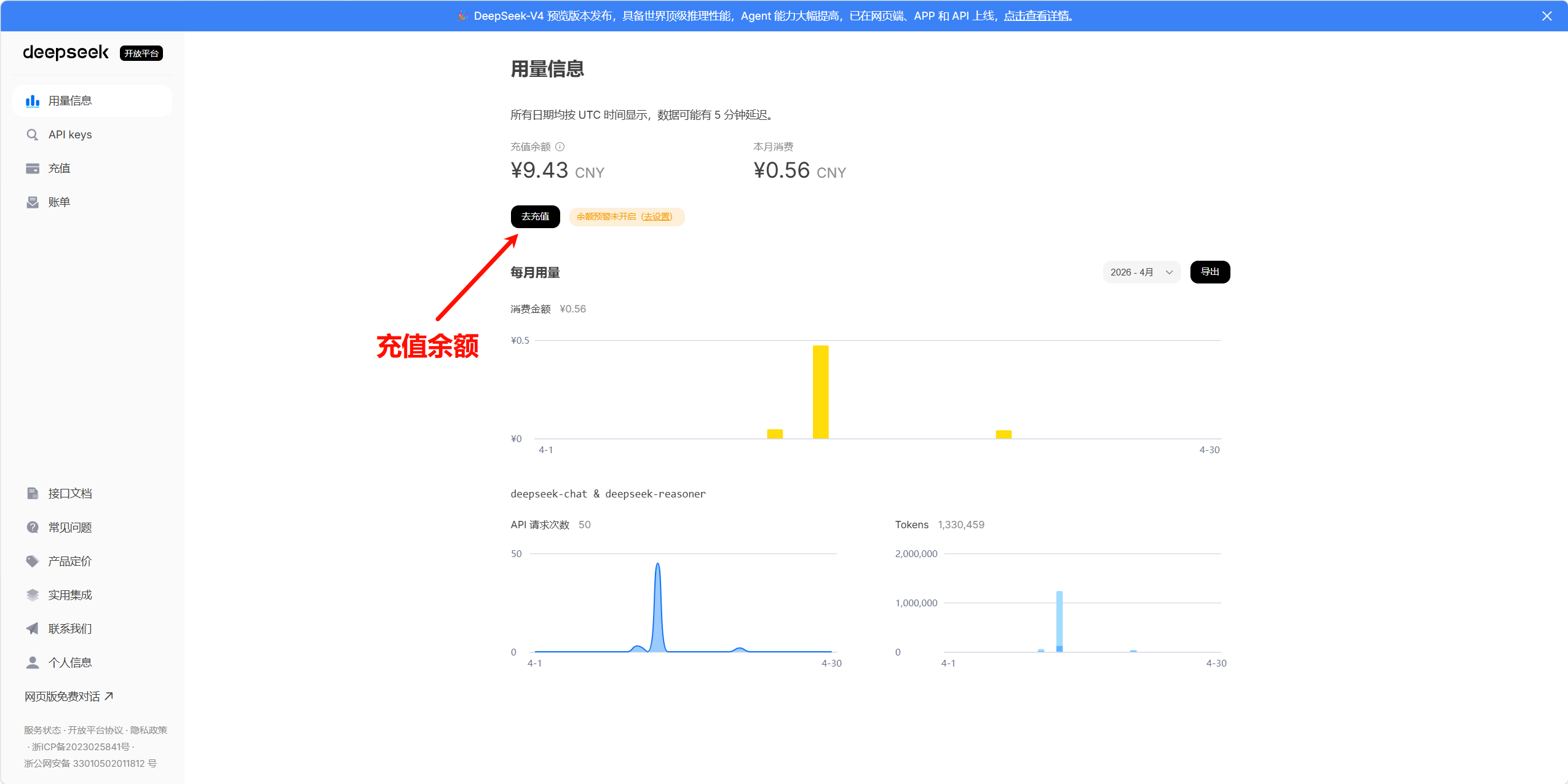 进入用量信息页面,查看当前账户余额。余额不足时,点击去充值,确保后续模型调用不受影响。