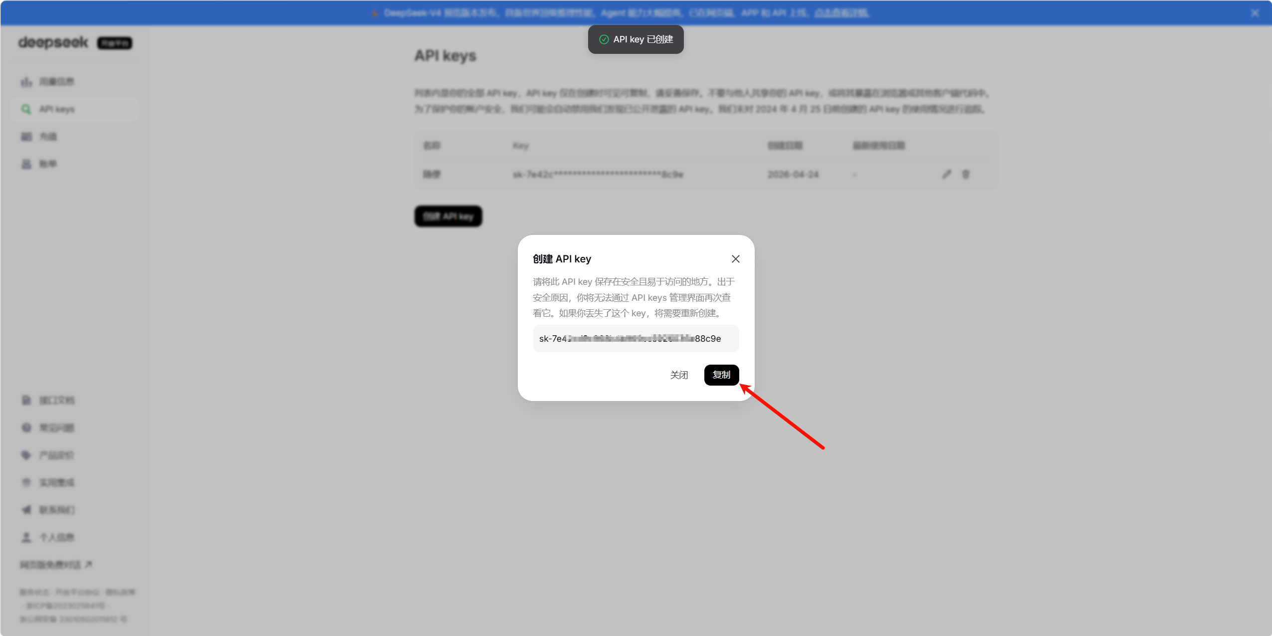 创建成功后,在弹窗中点击复制,保存好密钥。密钥仅在创建时完整展示,丢失后需重新生成。