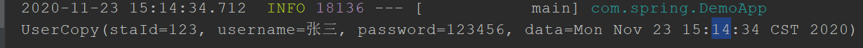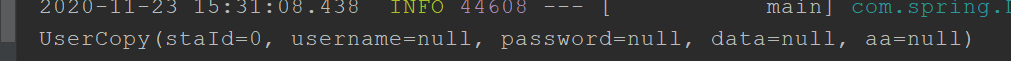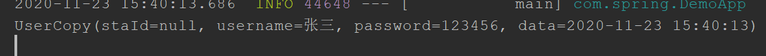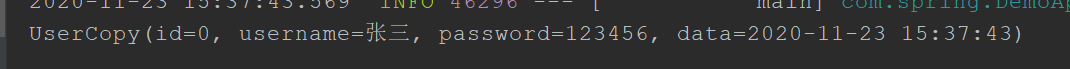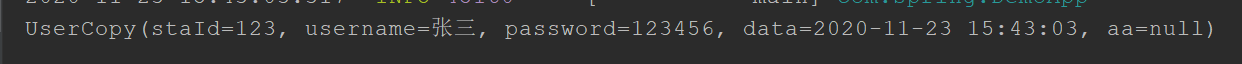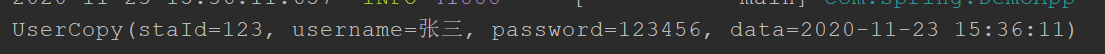 讯享网@SpringBootApplication public class DemoApp { public static void main(String[] args) throws InvocationTargetException, IllegalAccessException { SpringApplication.run(DemoApp.class,args); //1、设置User对象 User user = new User(); user.setData(new DateTime()); user.setPassword(""); user.setStaId(123); user.setUsername("张三"); //2、调用copyProperties方法将user赋值给userCopy对象 UserCopy userCopy = new UserCopy(); //(1)java自带的 //BeanUtils.copyProperties(userCopy,user); //(2)spring的.(注意参数是位置颠倒的) BeanUtils.copyProperties(user,userCopy); //打印copy结果: System.out.println(userCopy); } }赋值成功: