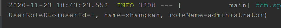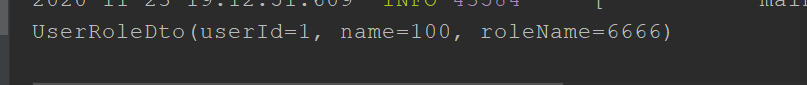 @SpringBootApplication public class DemoApp { public static void main(String[] args) throws InvocationTargetException, IllegalAccessException { SpringApplication.run(DemoApp.class,args); //1、初始化UserRole和Role两个对象 Role role = new Role(2L, "administrator", "超级管理员"); UserRole user = new UserRole(1L, "zhangsan", "12345", "", "", role); //2、调用映射配置接口的实例的toUserRoleDto方法 UserRoleDto userRoleDto = UserRoleMapper.INSTANCES.toUserRoleDto(user); //3、打印查看映射情况 System.out.println(userRoleDto); } }打印结果:可以看到都映射成功。
