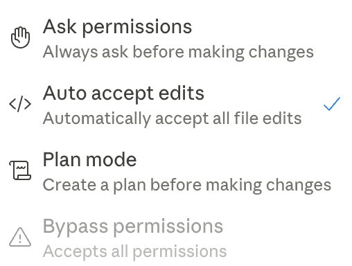 Claude Code 有不同的权限模式,控制它在执行操作前是否需要你确认。你可以理解为自动驾驶的不同档位。
