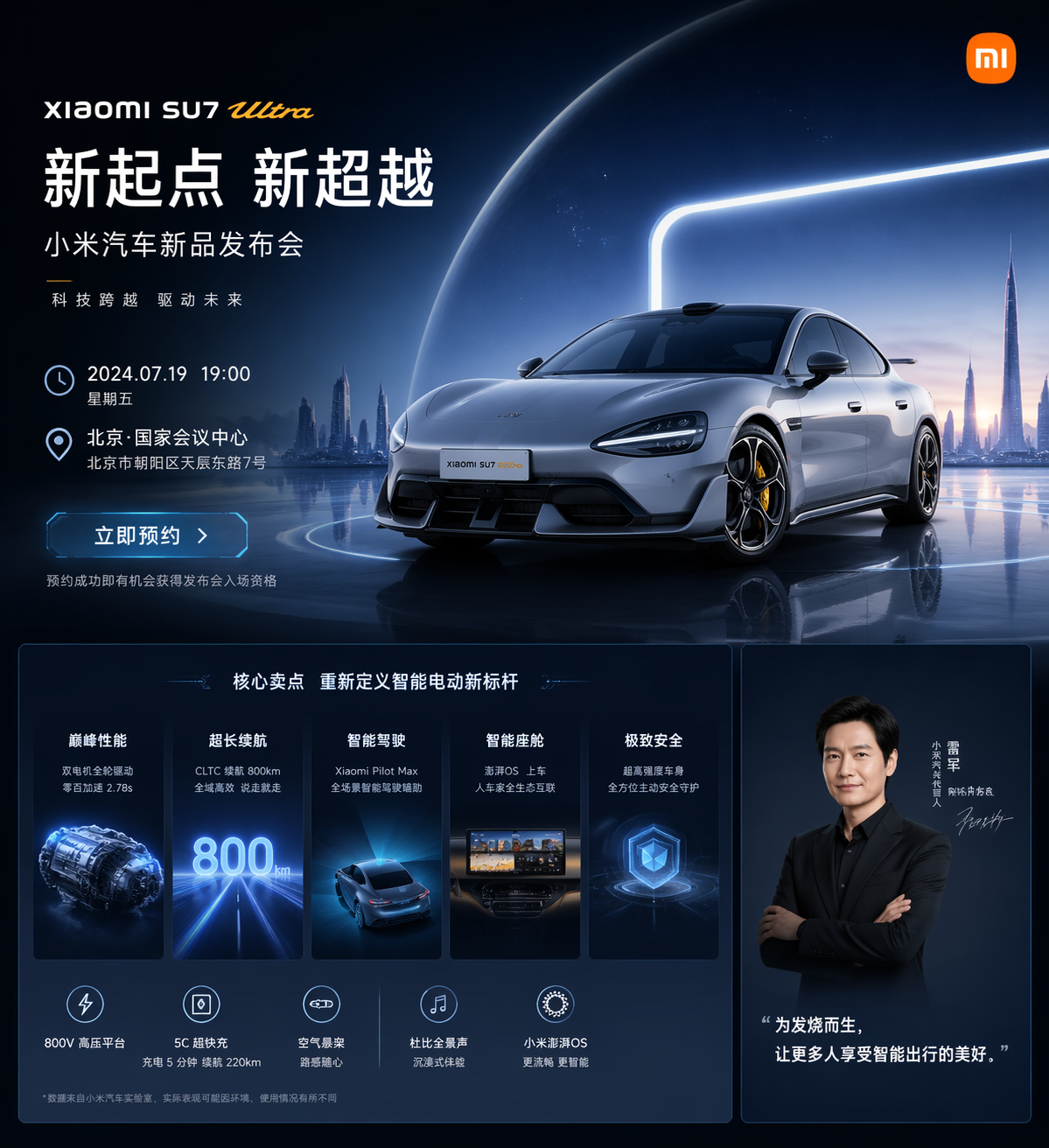 生成一个小米汽车新品发布会网页图片,包含发布会时间地点、产品核心卖点介绍和代言人信息,科技感设计风格