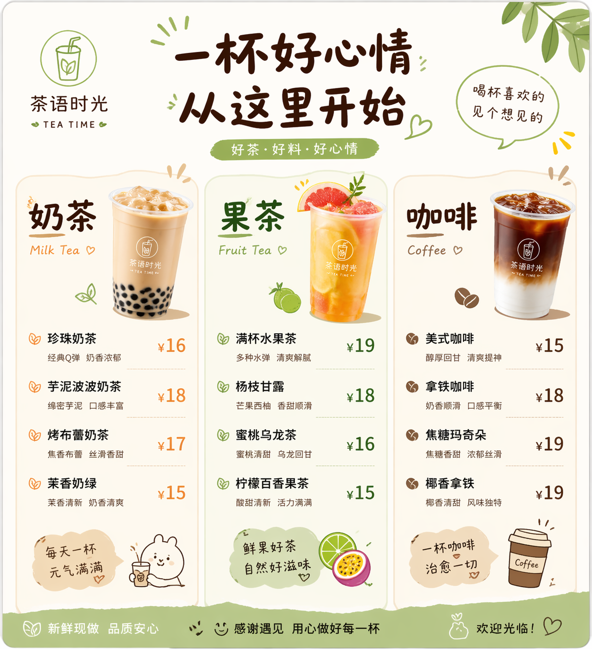 设计一张奶茶店菜单,包含分类:奶茶、果茶、咖啡,每类下面列出4个商品名称和价格,整体风格清新、年轻化、适合线下门店展示