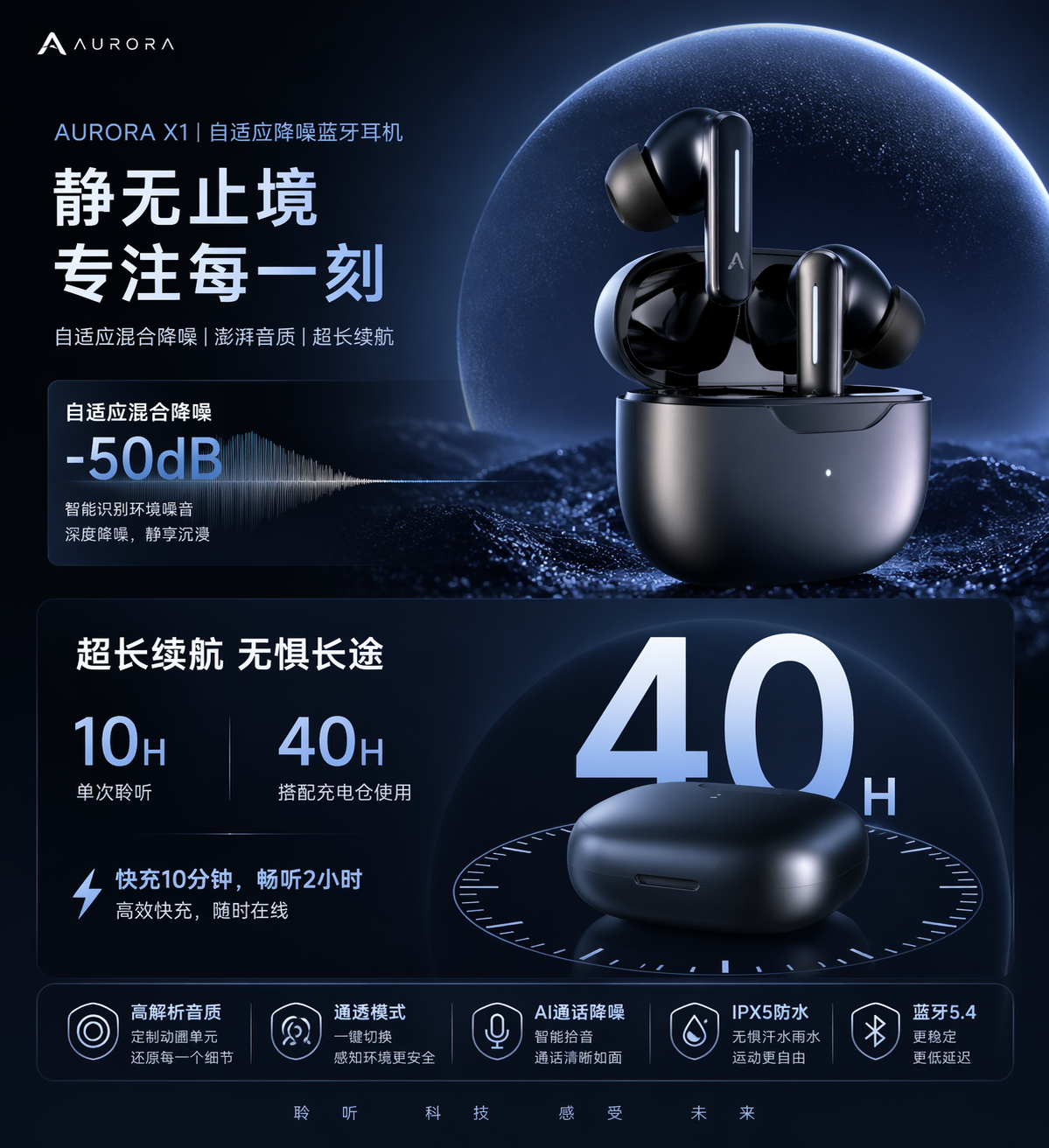 为这款蓝牙耳机生成宣传图片,突出降噪功能和续航优势,宣传图要符合产品的科技感和高端定位