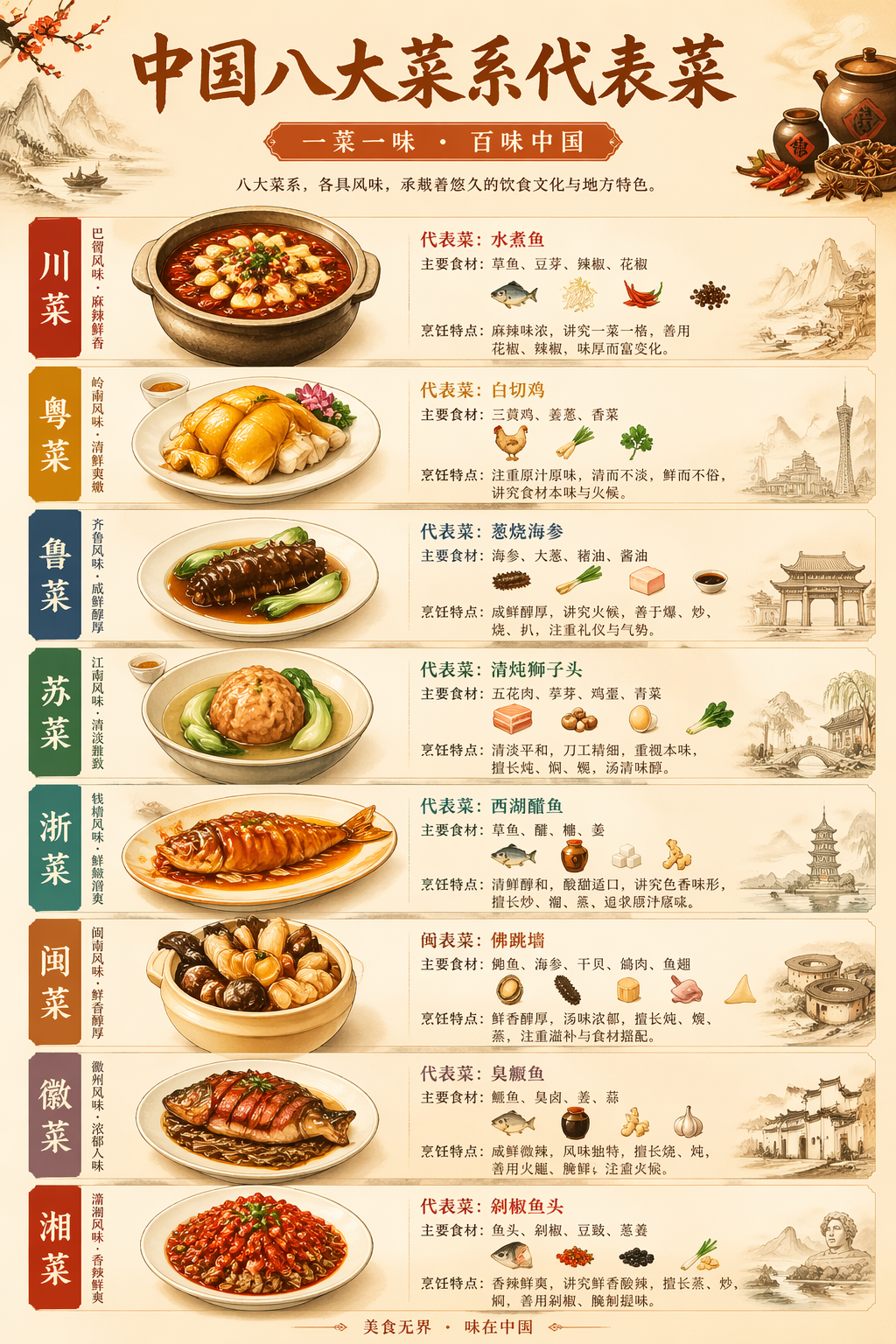 画一个竖版长图,主题是中国八大菜系代表菜。每道菜配上精美插画、菜系归属、主要食材、烹饪特点,像一个印刷品海报,配色温暖