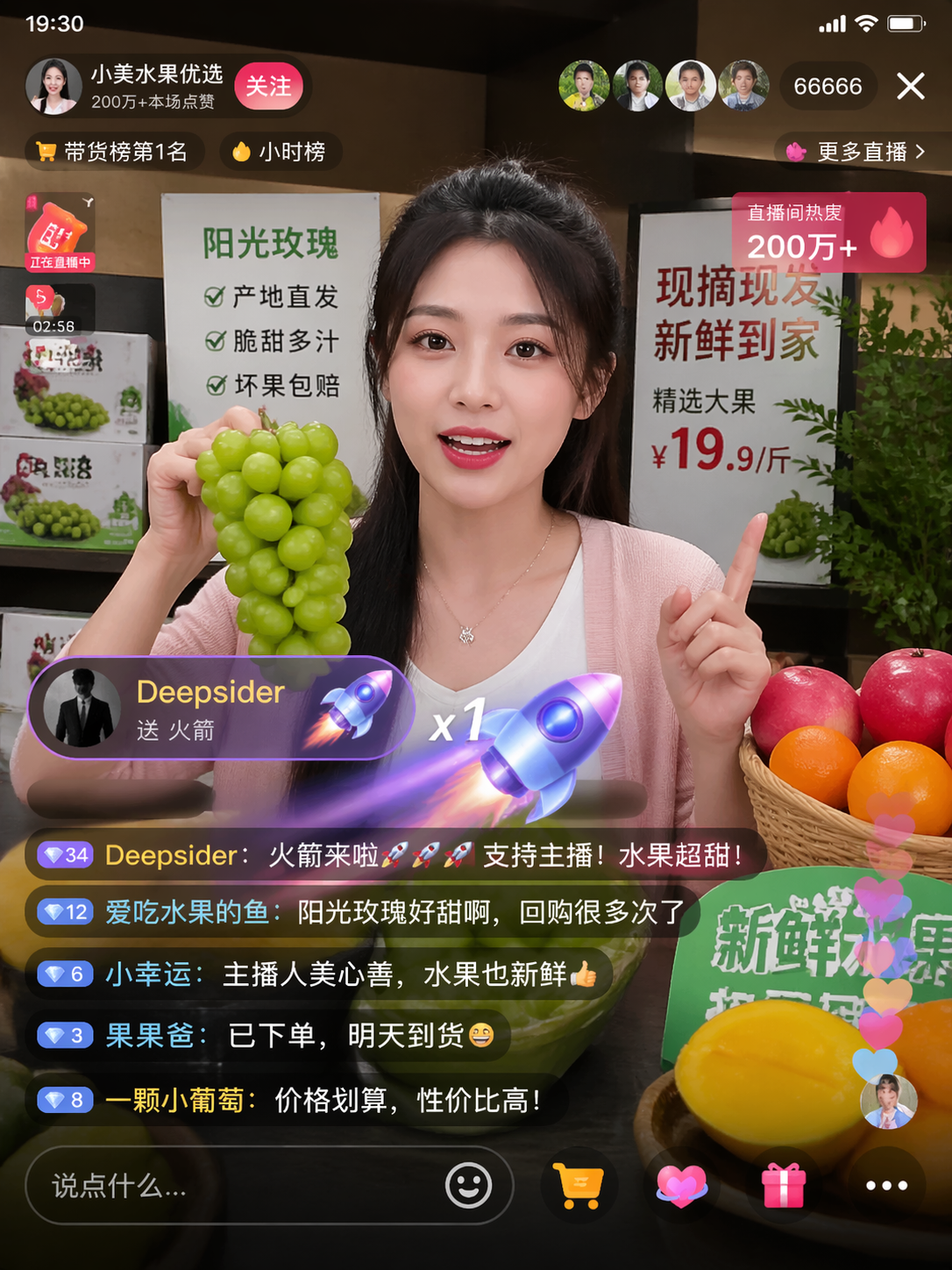 生成一个抖音直播的截图,主播在直播卖水果,在线人数是66666,热度是200万+,有个叫Deepsider的大哥刷了火箭礼物
