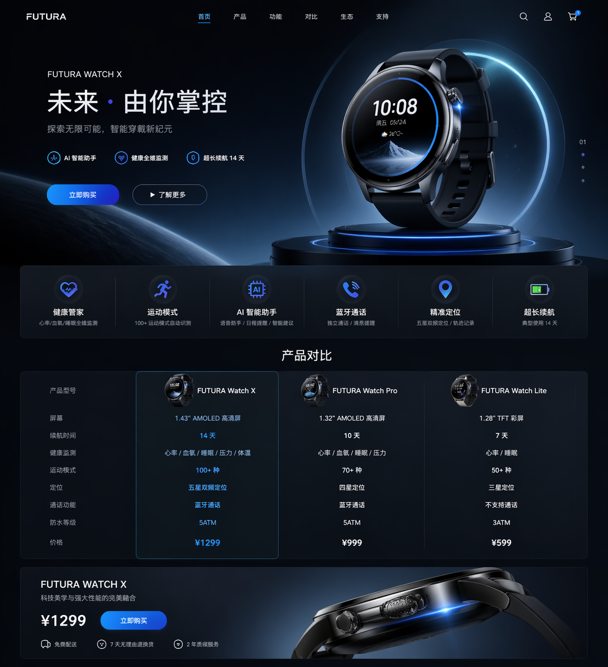 为一款智能手表产品生成符合科技感和未来感的官网UI设计稿,包含产品展示区、功能介绍、参数对比、购买入口