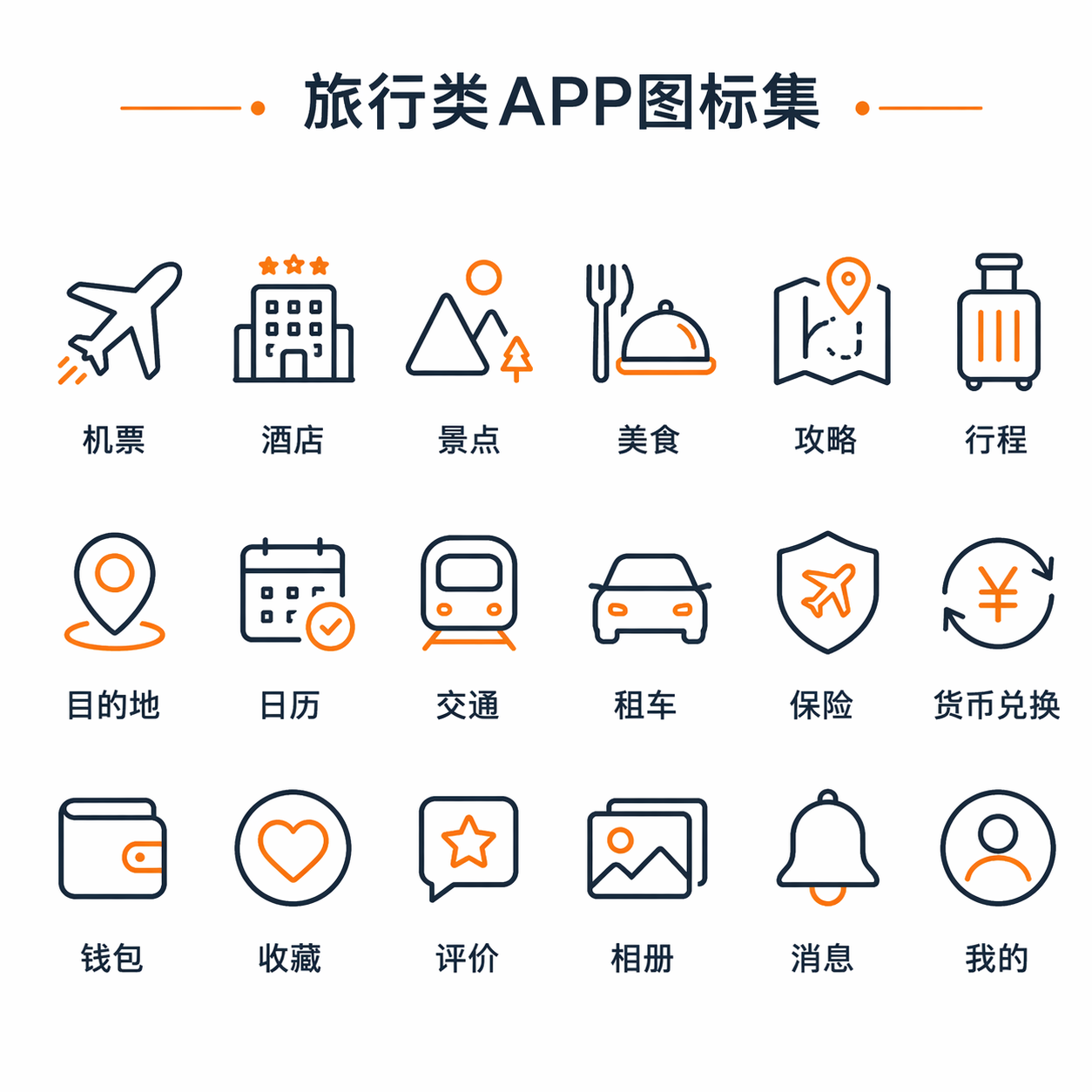 生成一套旅行类APP的图标集:极简线性图标,白底,双色(深蓝/黑 + 橙色强调),统一线宽2px、圆角端点,网格整齐排列3×6,每个图标下方配中文标签,顶部含标题。图标包含:机票、酒店、景点、美食、攻略、行程等。风格专业、扁平、矢量感