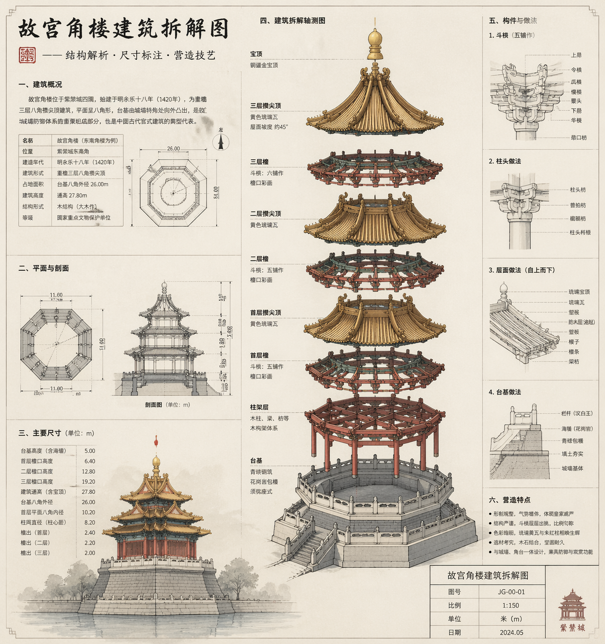 生成一个故宫角楼的建筑拆解图,有详细的结构说明和尺寸标注,中式美学风格,工程图纸质感