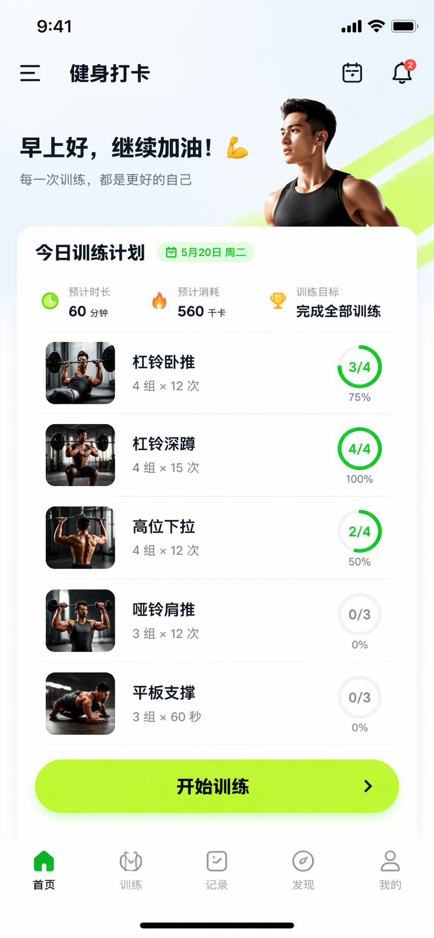 设计一个健身打卡App首页,顶部有导航栏,中间是今日训练计划,每个项目显示名称和完成进度,底部有开始训练按钮,整体风格运动、活力、接近iOS设计规范