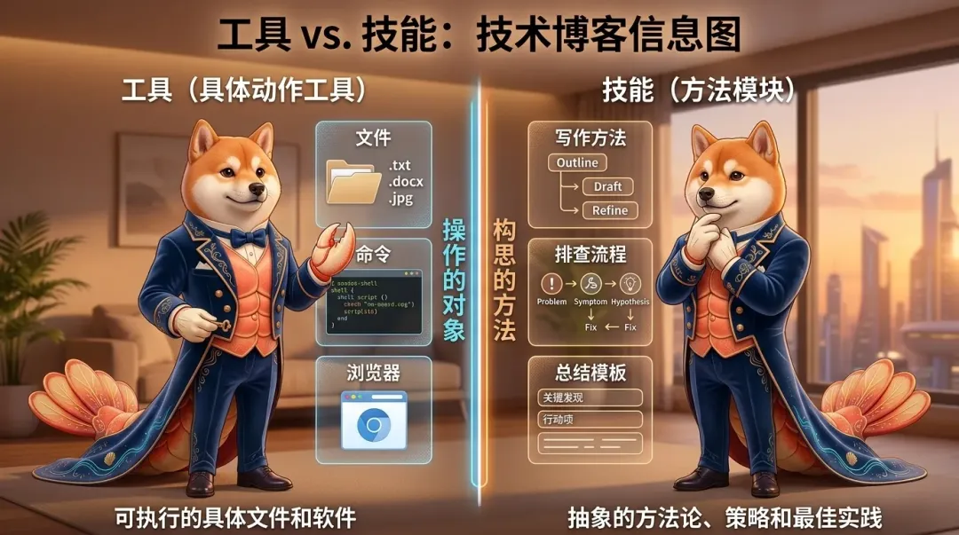 图:Tool 更像具体动作能力,Skill 更像围绕某类任务封装好的方法模块。