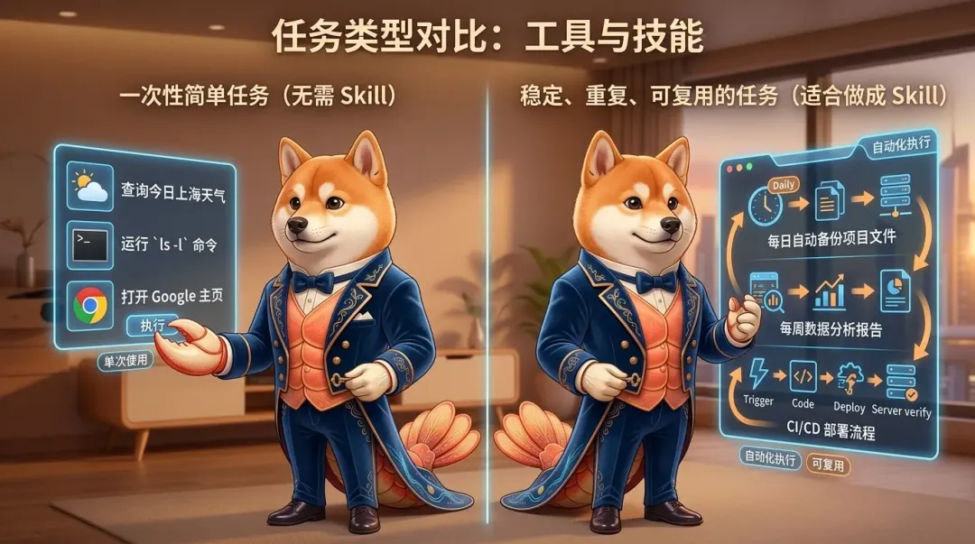 图:一次性简单任务未必需要 Skill;稳定、重复、可复用的任务更适合 Skill 化。