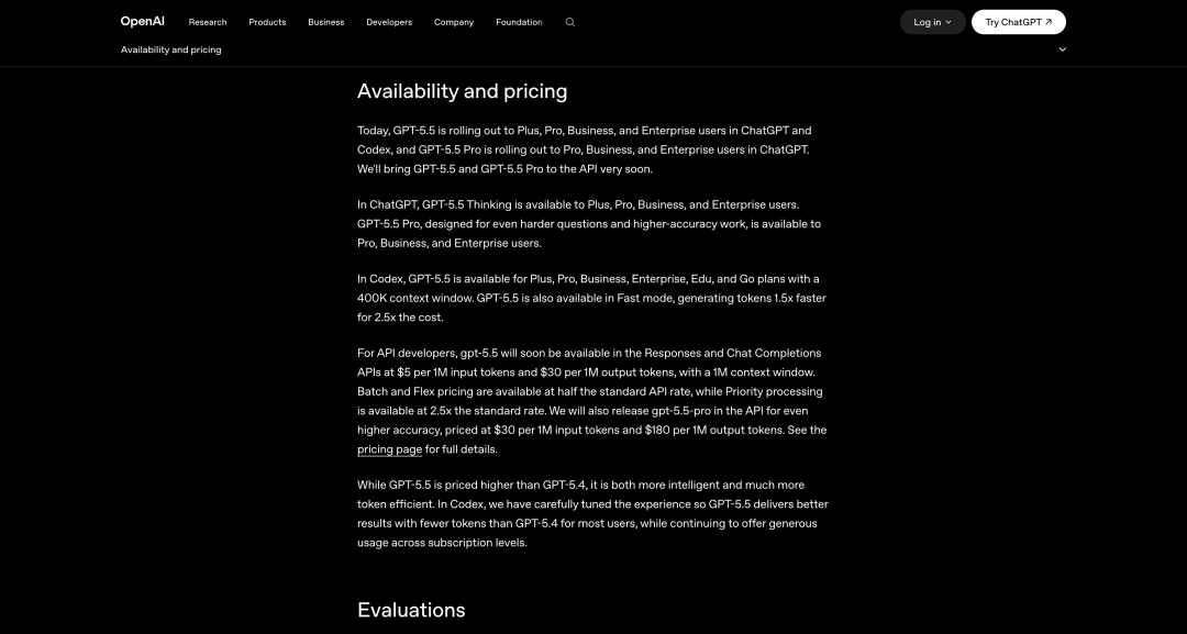 截至 2026 年 4 月 24 日,官方页面写得很清楚: ChatGPT 和 Codex 已经开始向指定订阅层级开放,API 还是 very soon,还没有在发布页里写成“已经全面可用”。