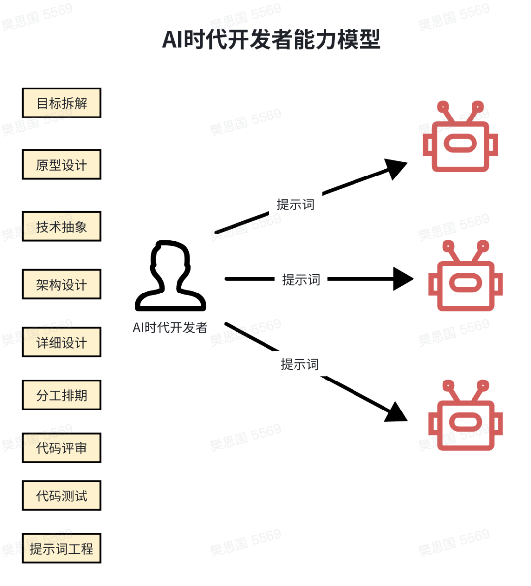 AI时代的开发者,用AI而不依赖AI。开发者应该具备优秀的目标拆解和技术抽象能力,应该成为架构师、产品经理、需求分析师、工程师、代码评审人员和测试人员,AI是体力劳动者。