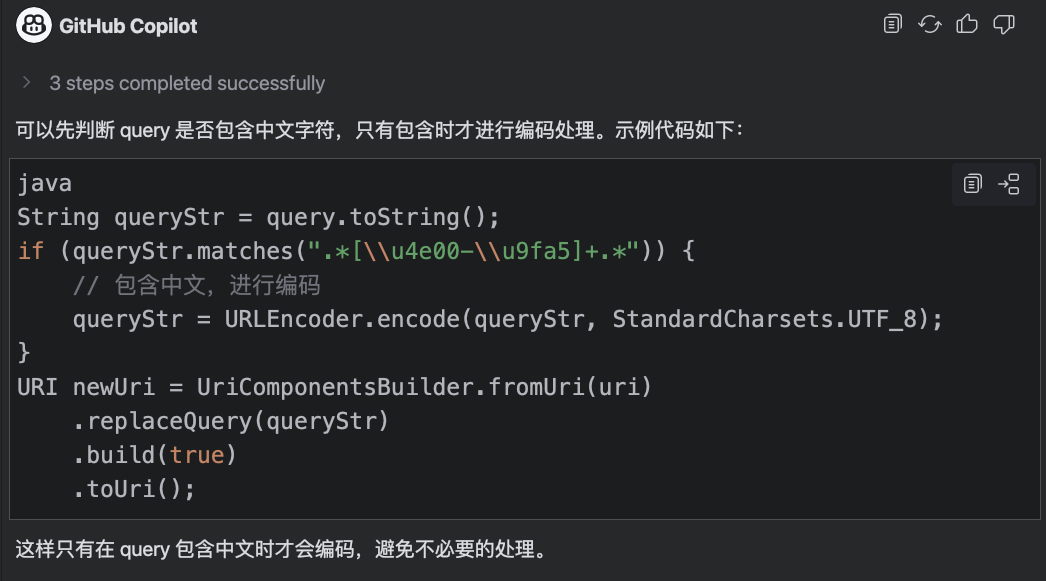 URI newUri = UriComponentsBuilder.fromUri(uri) .replaceQuery(query.toString()) .build(true) .toUri();这段代码处理query中包含中文情况,让它不报错。如果包含中文则处理,不包含则不处理