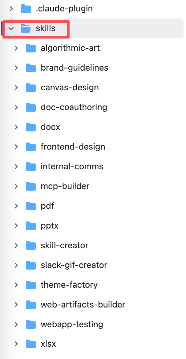下图是Anthropic官方收录的skills集合,基本上涵盖了职场人士的高频技能任务,如office套件、前端设计、画图等