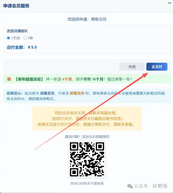 好靶场会员订阅 首先点击会员订阅 ,然后选择对应的套餐 ,选择对应的会员去支付 ,支付完成后即可会员到账