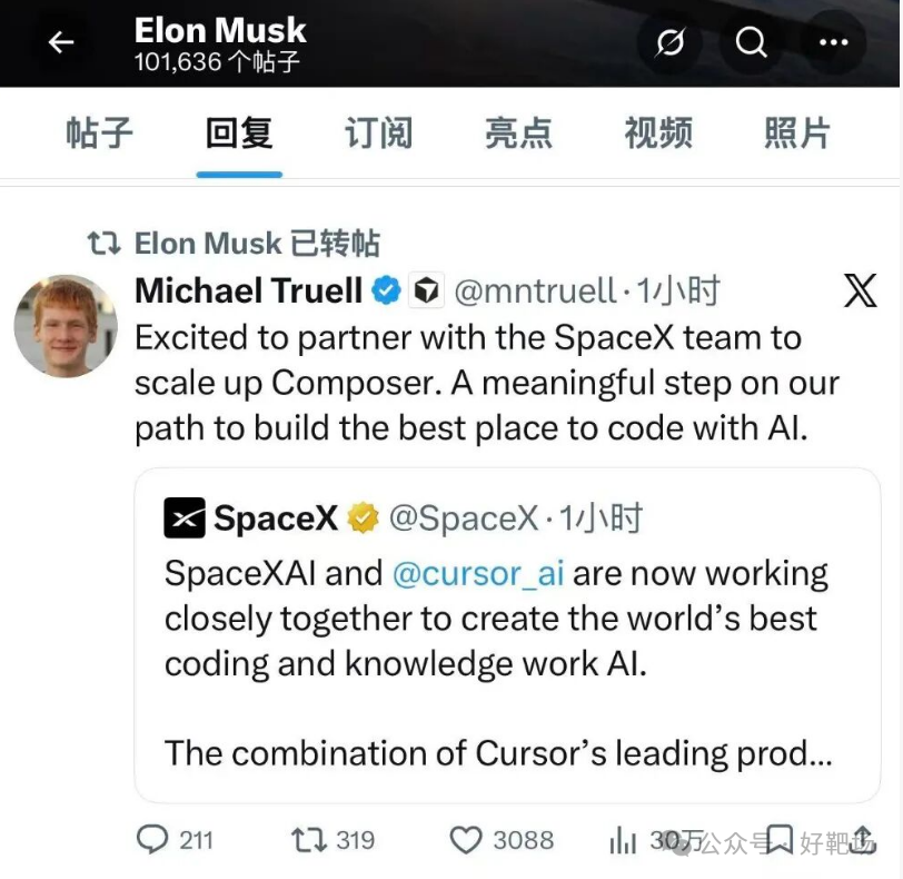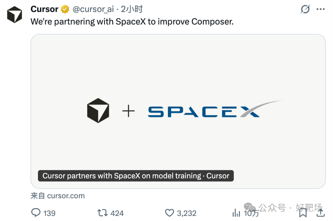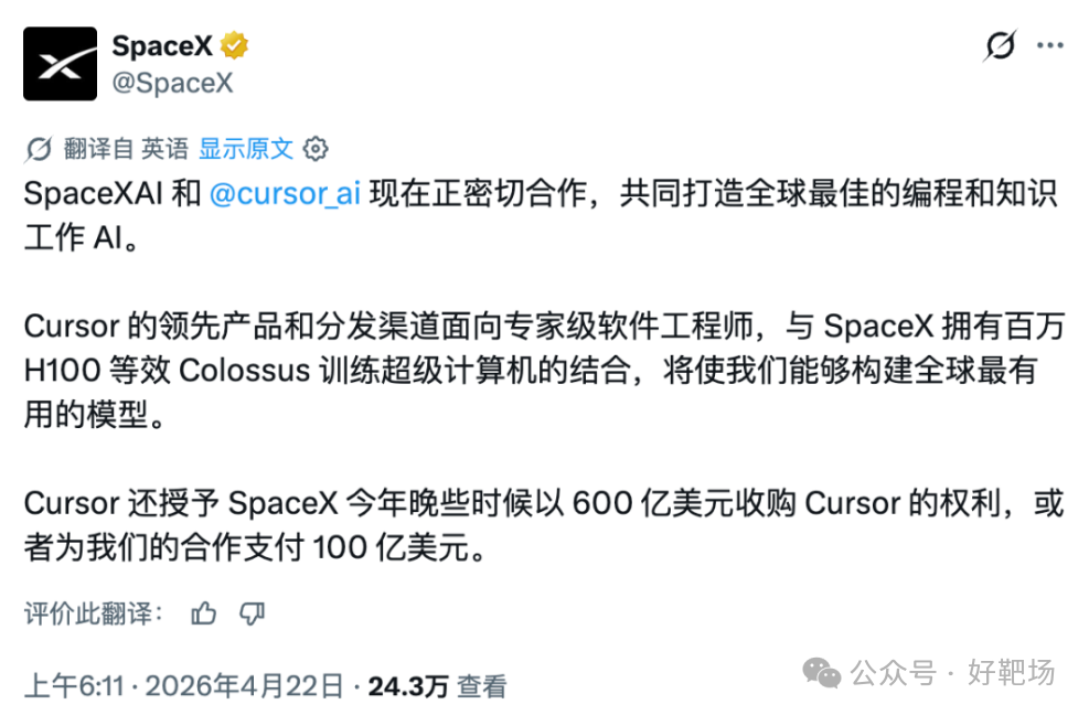 当地时间 2026 年 4 月 21 日,埃隆・马斯克旗下太空探索技术公司 SpaceX,通过其官方 X 平台账号发布声明,正式对外宣布已与 AI 编程初创公司 Cursor 达成深度战略协议。 截至本报道发布(2026 年 4 月 22 日),SpaceX 并未完成对 Cursor 的全资收购,而是通过该协议获得了 Cursor 的独家收购选择权,这也是本次事件的核心事实。 SpaceX 在官方声明中明确表示:“SpaceX AI 和 Cursor AI 目前正在紧密合作,共同打造世界上最好的编码和知识工作人工智能。Cursor 的领先产品及其面向专业软件工程师的分发渠道,结合 SpaceX 的百万级 H100 等效 Colossus 训练超级计算机,将使我们能够构建世界上最有用的模型。” 该声明发布后,Cursor CEO Michael Truell 随即转发该推文并表示 “很高兴能与 SpaceX 团队合作,共同扩展 Composer”,马斯克也转发了该内容予以回应。