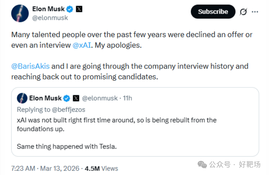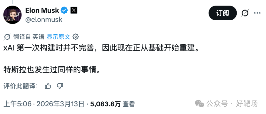 2026 年 3 月,马斯克公开承认 xAI 旗下 Grok 模型在编程工具领域落后于行业竞争对手,同期对 xAI 启动团队裁员与重组;
