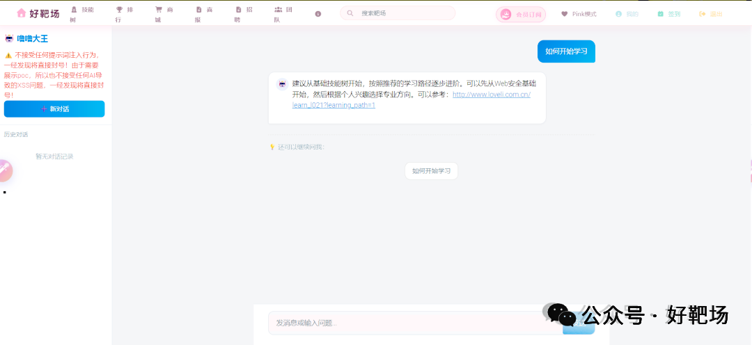 为方便学习还有提问,我们设计了好靶场Ai客服机器人,可以完成简单的客服能力,以及好靶场日常靶场提醒更新、根据你的询问推荐靶场