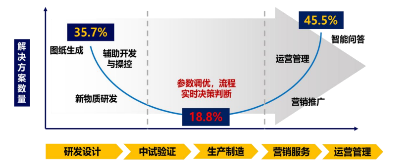 企业对大模型的应用需求快速升温,大模型在诸多行业逐渐落地应用,形成了以头部企业和头部场景为引领的头雁效应。根据2024年公开的大模型中标信息统计显示,中标项目数量和金额是2023年的十倍之多,且项目数量平均每月以 40%的速率增长。从采购方企业看,近六成为大型央国企,以运营商、金融和能源三大行业为主中标项目金额超过总金额的一半。从场景分布看,高附加值场景更为集中,大模型应用场景呈现微笑曲线分布,“两端快、中间慢”特征明显。在研发设计、营销运营等高附加值场景率先发力,该类场景的应用价值更加明确,可有效减少人力投入,实现降本增效,而中部的生产制造等低附加值场景因落地路径不清晰、投入产出不明确等因素但这也恰恰是大模型落地应用的蓝海。