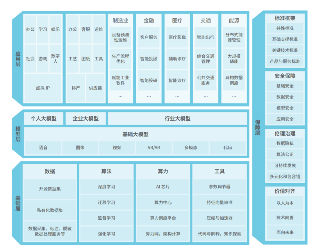 大模型产业链可以划分为基础层、模型层、应用层三大核心层级,以及贯穿各层的支撑服务。