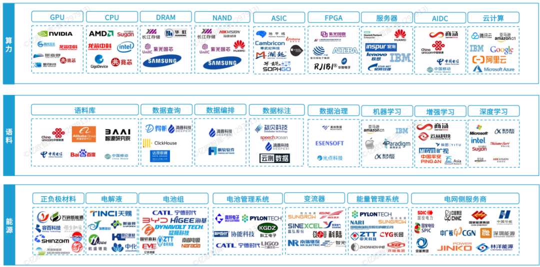 定位: 整个产业的“卖水人”和“军火商”,提供训练和运行大模型所必需的底层资源。在大模型的发展过程中,数据、算力、算法和工具是大模型发展的基础和支撑。AI训练芯片(英伟达/华为昇腾/寒武纪)、存储芯片、服务器集群,占大模型成本40%以上。
