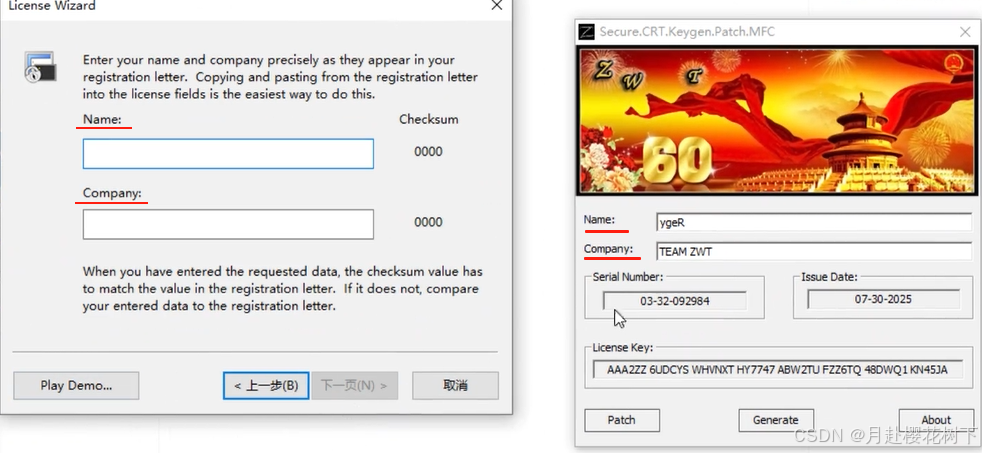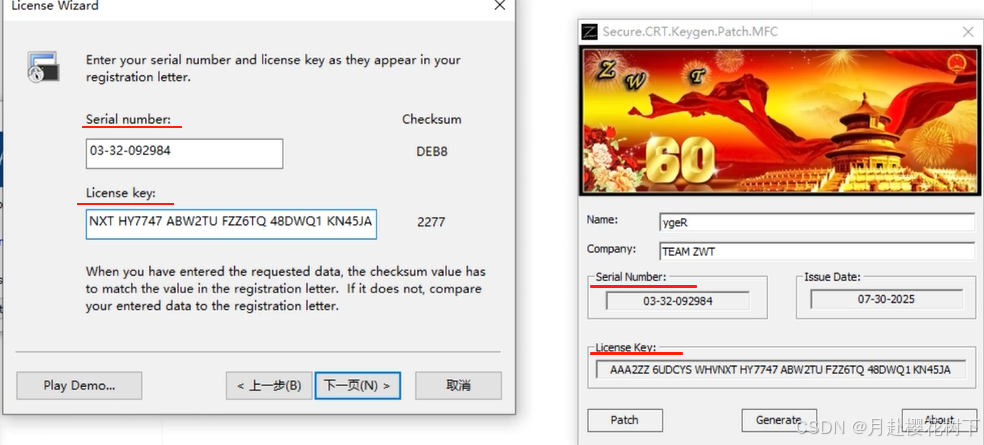 6、复制注册器中 Serial Number 和 License Key ,粘贴到 SecureCRT 软件中