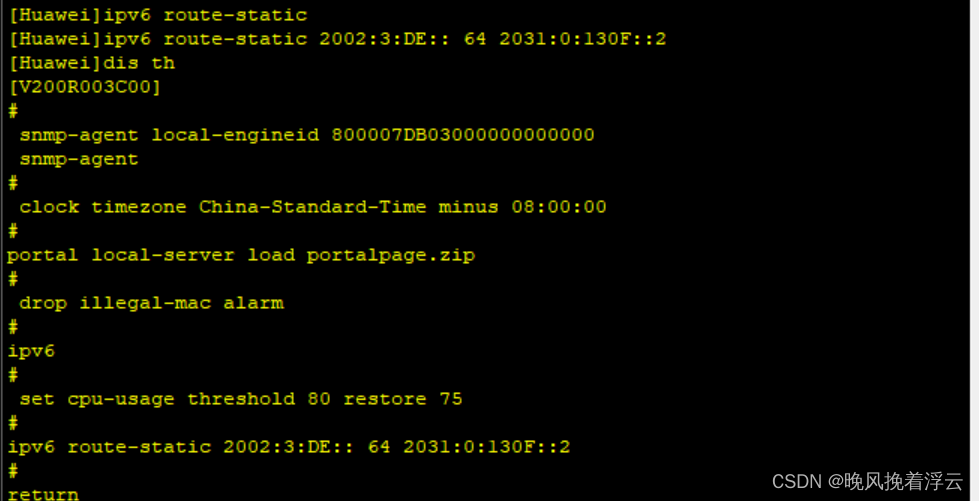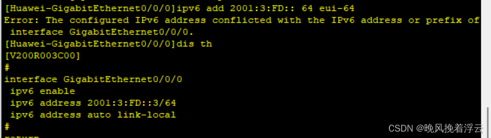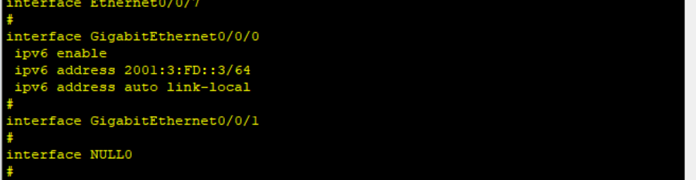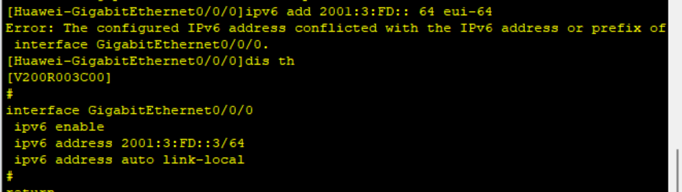 讯享网# interface GigabitEthernet0/0/0 ipv6 enable ipv6 address 2002:3:DE::3/64 ipv6 address auto link-local