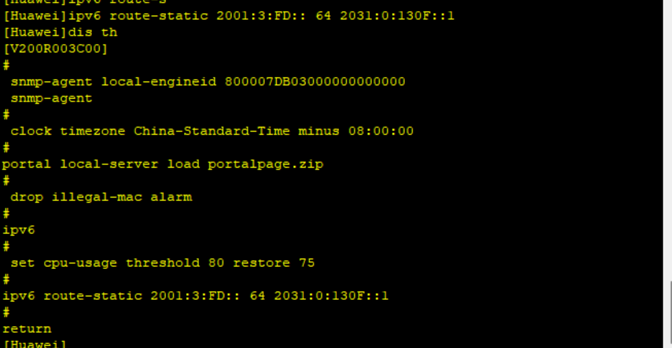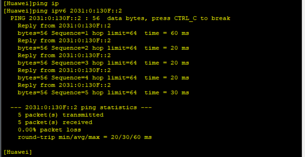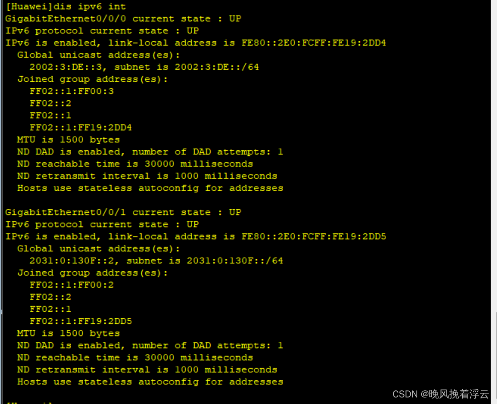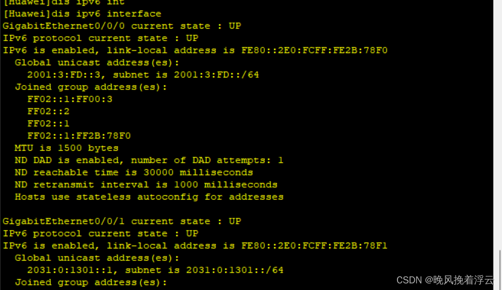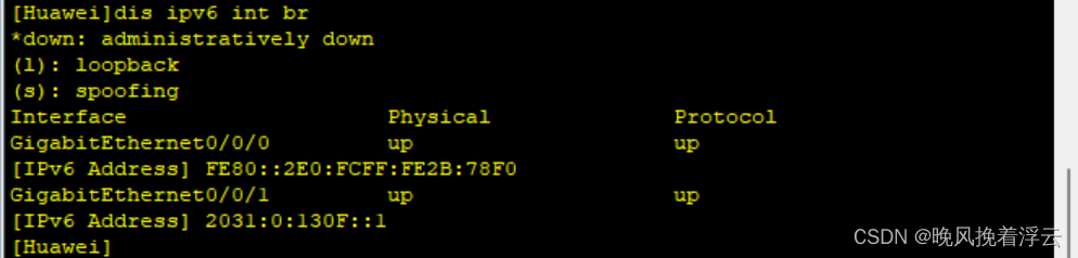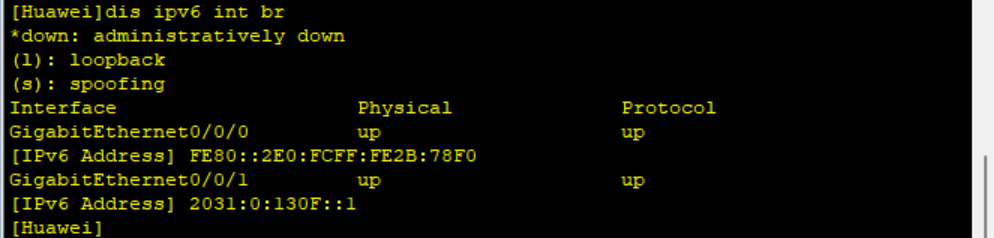 # interface GigabitEthernet0/0/1 ipv6 enable ipv6 address 2031:0:130F::1/64 ipv6 address auto link-local