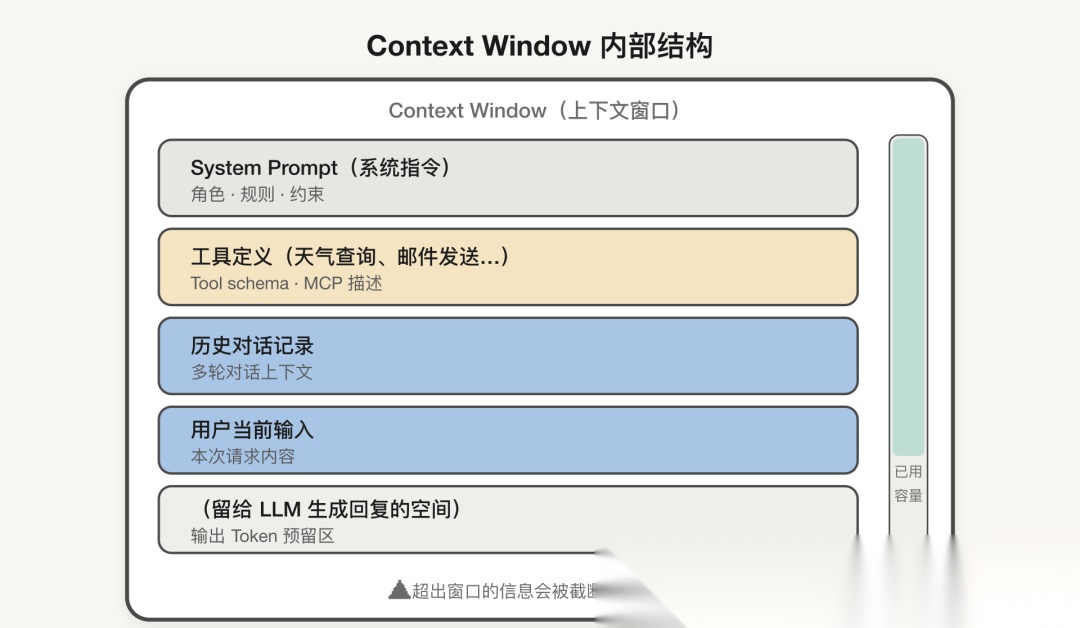 当对话越来越长,历史消息越来越多,Context Window 就会被塞满。这时候系统必须做出取舍——通常是丢弃最早的对话记录,或者对历史内容做摘要压缩。这就是为什么你和 AI 聊了很久之后,它可能会"忘记"你们最开始聊的内容。